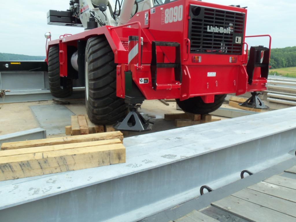 CRANE JACKED UP ON TIMBERS TO CLEAR SUPPORT BEAM FULLY RETRACTED OUTRIGGER ON CENTER ROOF BEAM FULLY EXTENDED OUTRIGGER ON SIDE WALL |