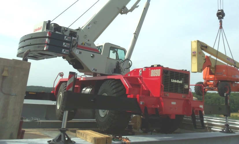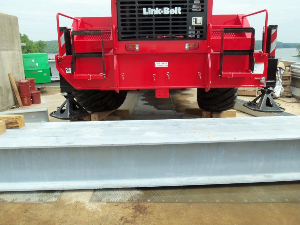 STRIPPED 90-TON LINKBELT RTC 8090 SERIES II DRIVEN ACROSS TOWER ROOF WITH 57.5 DEGREE BOOM FOR 50/50 AXLE LOADING