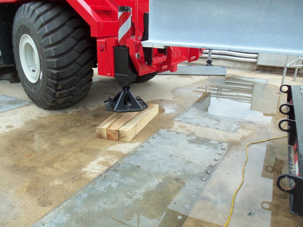 CRANE JACKED UP AND WOOD CRIBBING PLACED UNDER TIRES |